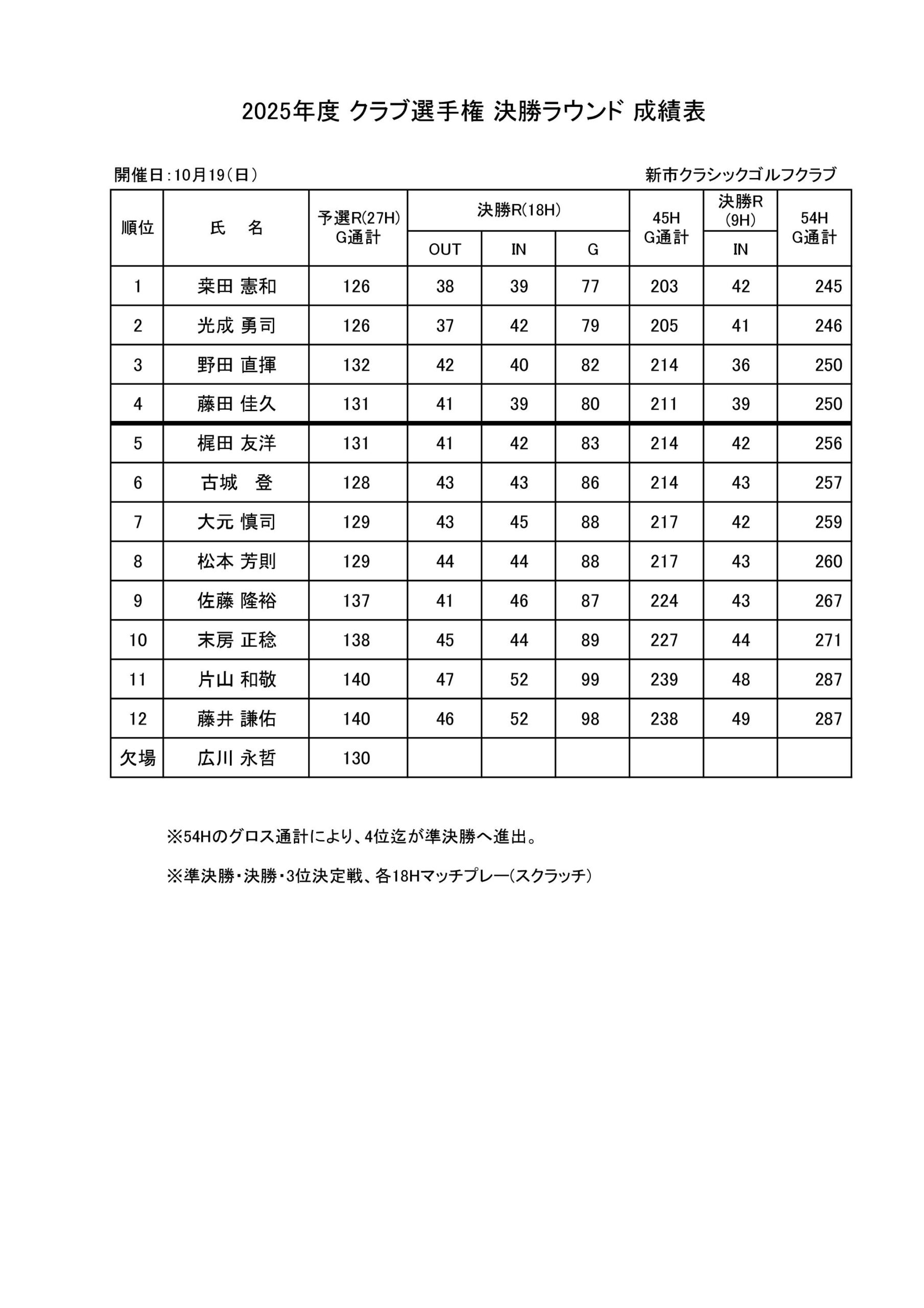 2025年クラブ選手権決勝ラウンド成績表及び準決勝・決勝組合せをUPしました。
